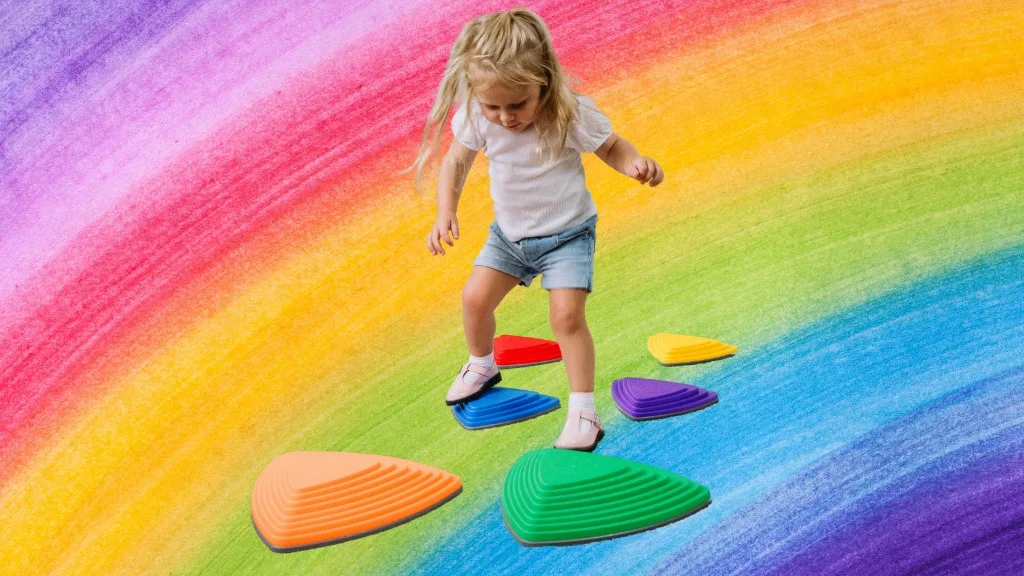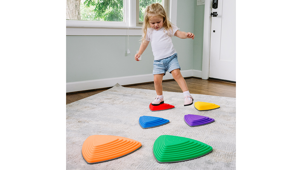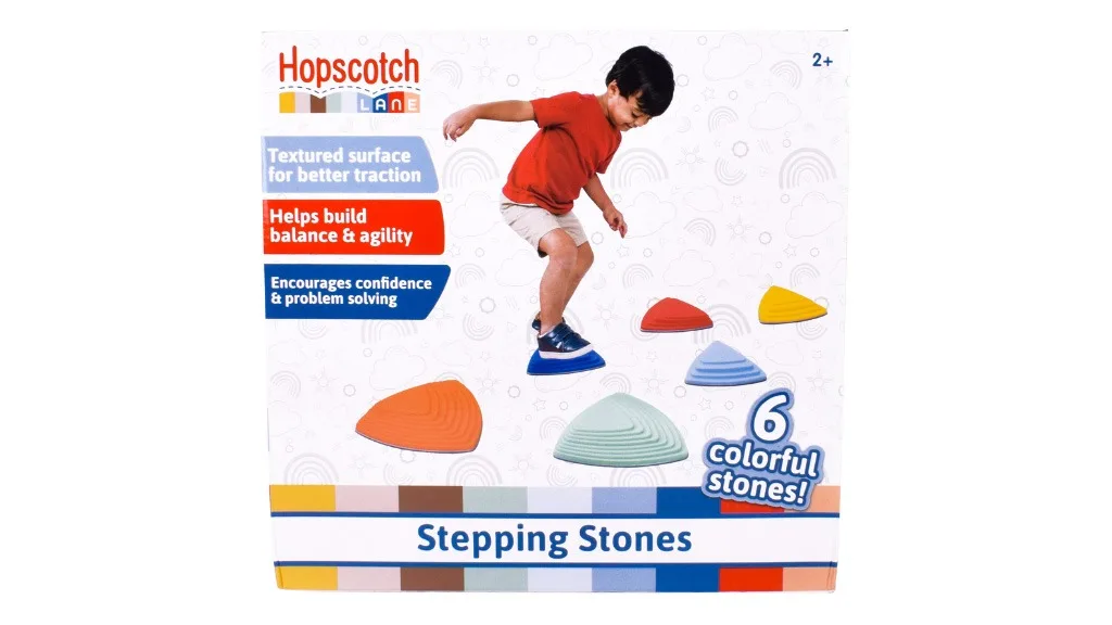 Tato sada obsahuje šest živě barevných kroků ve dvou velikostech a moderních barvách – žlutá, červená, světle modrá, zelená, oranžová a tmavě modrá. Každý kámen je vyroben s texturovaným povrchem a gumovým dnem pro jistou přilnavost, takže každý krok je bezpečný a zábavný. Navíc tyto kroky jsou univerzální, umožňují dětem vytvářet různé cesty, po kterých mohou chodit a skákat, aniž by se dotkly podlahy.