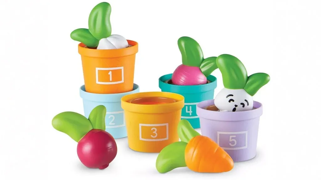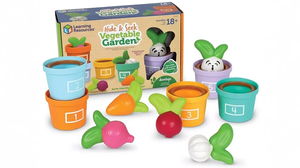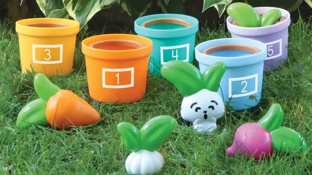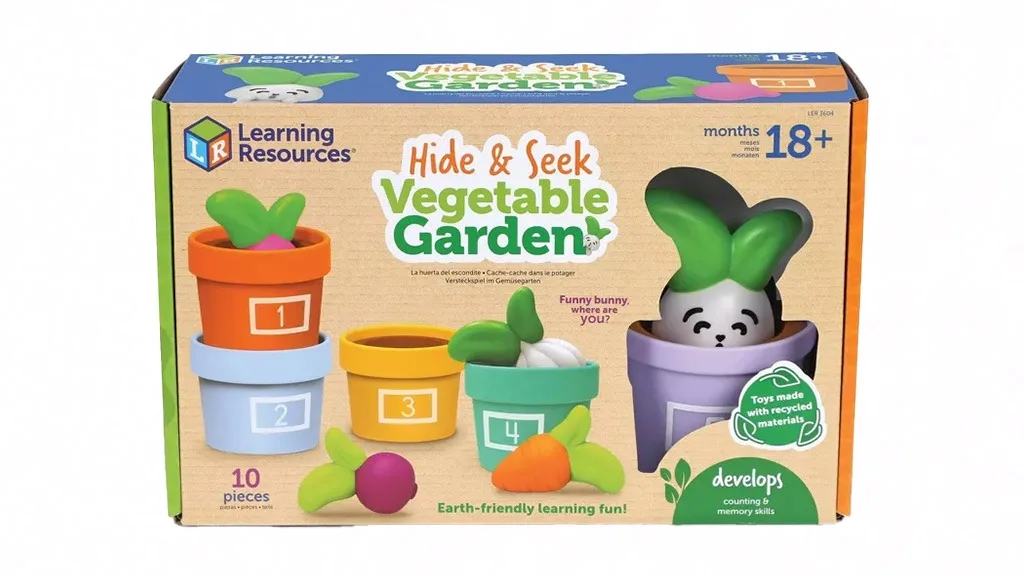 Hádanky a Zahrada Zeleniny je sada 10 her, která motivuje děti k procvičování počítání, hromadění a třídění. Součástí jsou pět pastelových, číslovaných květináčů a gumové zeleniny, včetně stroužku česneku, oranžové mrkve, červené řepy a ředkvičky. Děti mohou také v pátém květináči najít kamaráda: Veselého Králíčka!