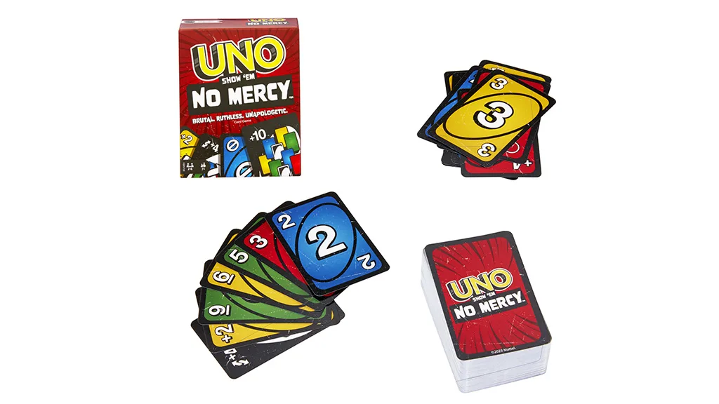 UNO - Bez milosti! Nemilosrdný zvrat ve světově oblíbené hře UNO. Tato verze přidává 56 nových karet a speciální pravidla pro průběh hry. Hráči najdou tvrdší akční karty, jako je Vynechání všech a Tahání 10 karet.