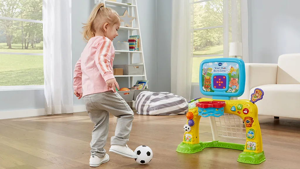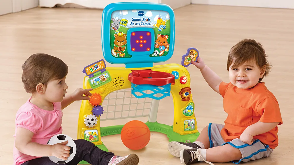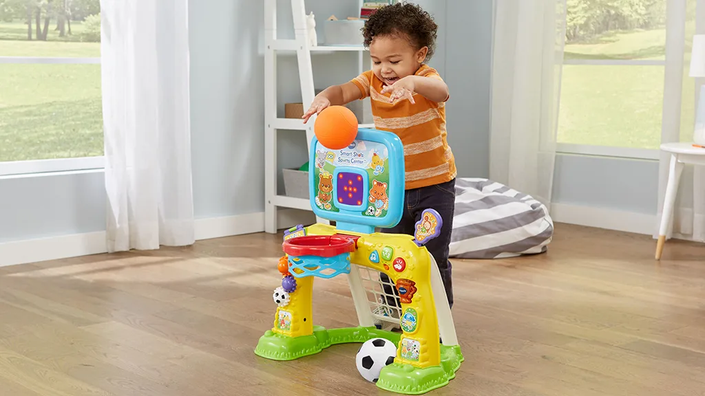 Tato sada elektronického sportovního centra od VTech obsahuje fotbalovou branku a basketbalový koš pro malé sportovní fanoušky. Děti mohou házet basketbal do koše a sledovat, jak LED displej počítá koše, nebo kopnout míč do branky a slyšet, jak centrum reaguje povzbudivými zvuky a větami. LED displej nejenže počítá koše, ale také povzbuzuje děti k aktivní hře zábavnými animacemi. Kromě toho jsou zde ozubená kola, která mohou děti otáčet, a tlačítka, která mohou stisknout, aby se naučily čísla, barvy, tvary a mnoho dalšího.
