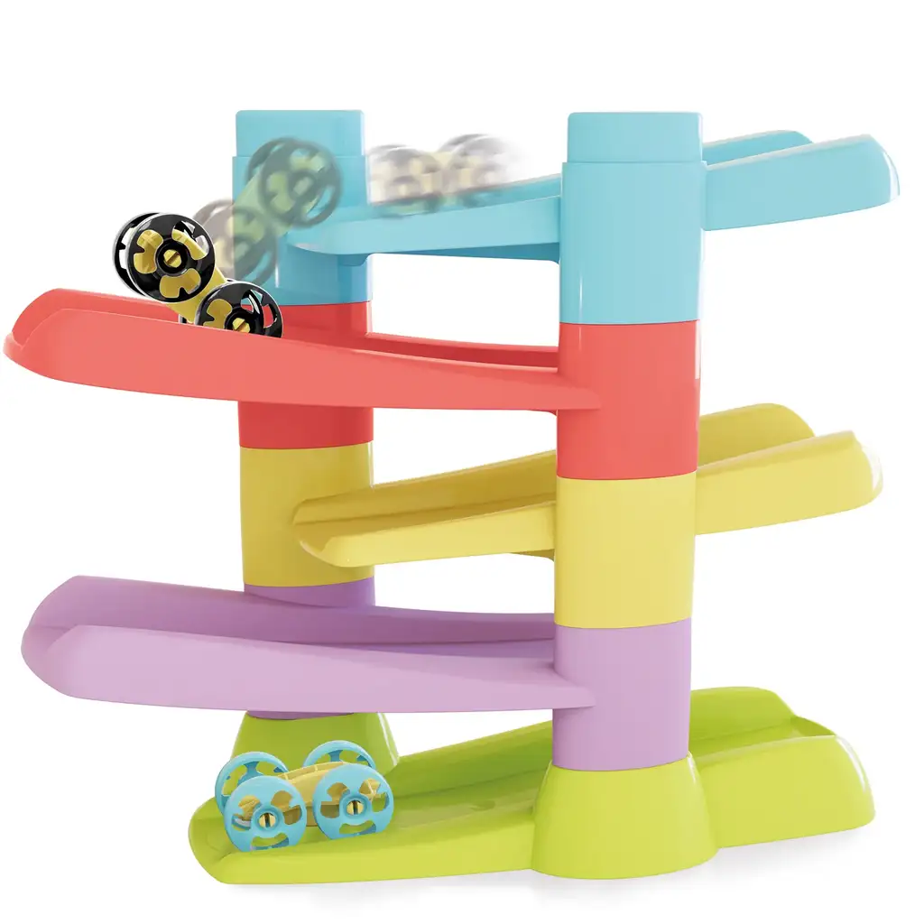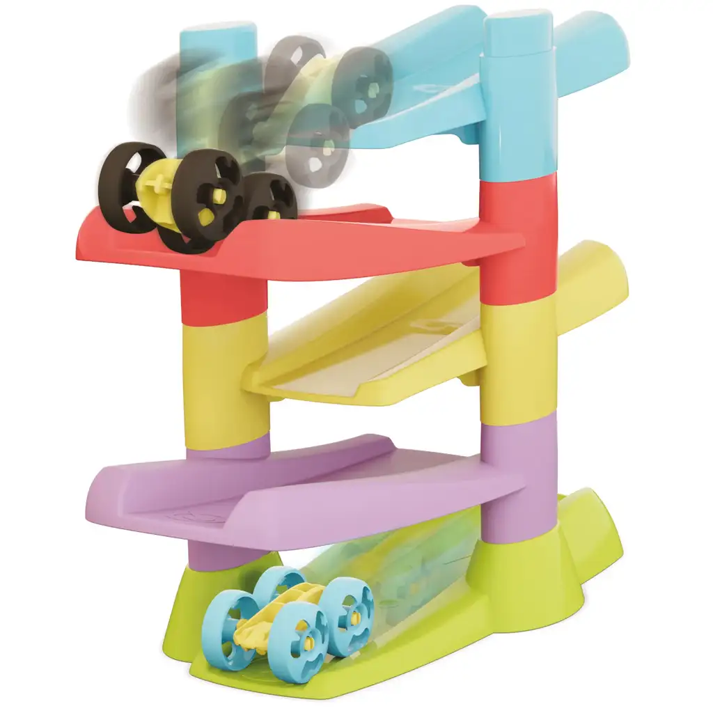 Věž vede malé flip autíčka přes 5 úrovní, přičemž na konci každé rampy se automaticky otočí a pokračují v jízdě dolů. Tento „flip“ pohyb není jen efektní, ale zároveň pomáhá dětem pochopit princip příčiny a následku a motivuje je k opakování, experimentování a objevování.