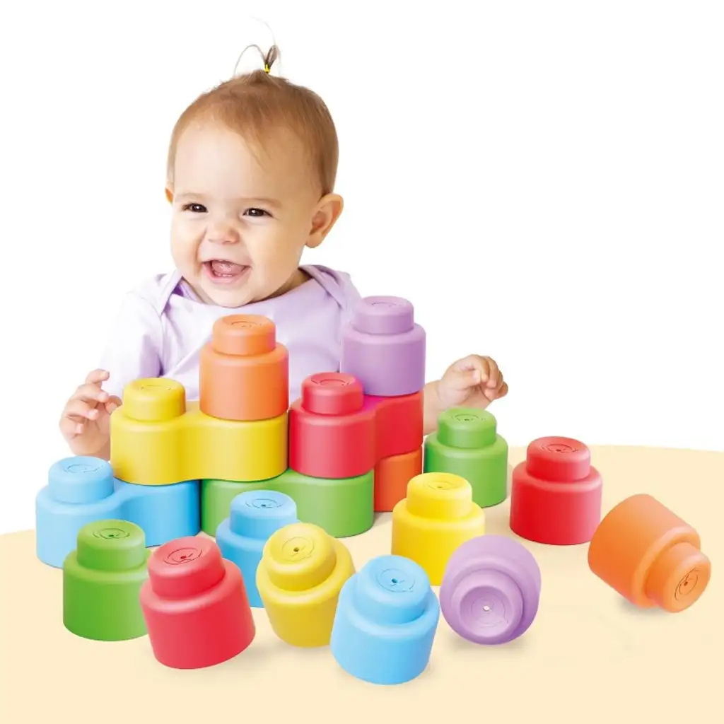 28 měkkých, barevných stavebních kostek