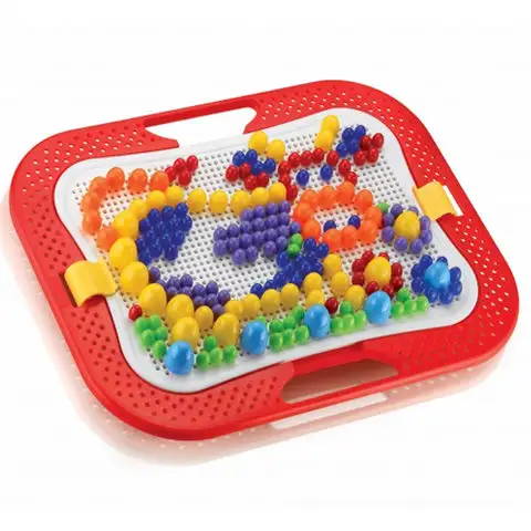 Díky této fantastické sadě kolíčků můžeš nyní tvořit na zvětšené ploše. Neboť nejen na speciálně pro tento účel určeném návrhářském prkénku, ale i na oblasti fungující jako rámec, se nacházejí malé otvory, takže barevné kolíčky lze snadno vložit i tam. Začni se zábavou co nejdříve, pokud chceš realizovat i vlastní nápady na obrázky, ale můžeš se inspirovat i z přiloženého alba pro vytvoření nějakého skvělého obrázku. Hra je opravdu praktická, protože je vybavena i rukojetí, díky čemuž ji můžeme vzít kamkoli s sebou. Kromě toho můžeme kolíčky jednoduše ukládat pod tvůrčí plochou.