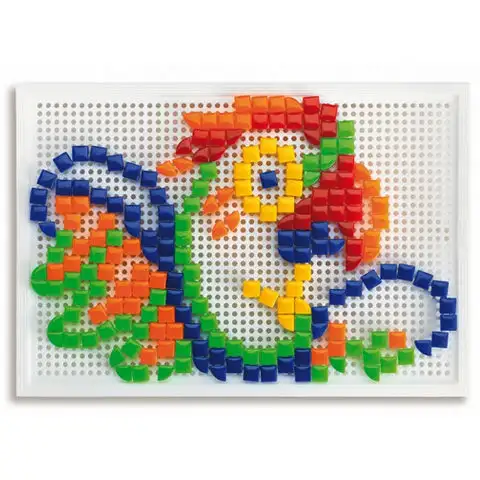 Tentokrát jsme vyměnili obvyklé tlačítka za něco vzrušujícího. S pomocí malých tlačítek ve tvaru trojúhelníků a čtverců můžeme velmi snadno vytvořit přesný vzor. Do průhledné plastové desky můžeme vytvářet vlastní nápady, ale můžeme také čerpat inspiraci z přiloženého alba, kde najdeme hotové obrázky. Hra je perfektní nástroj pro rozvoj dovedností a kreativity, a to vše v hravé formě.