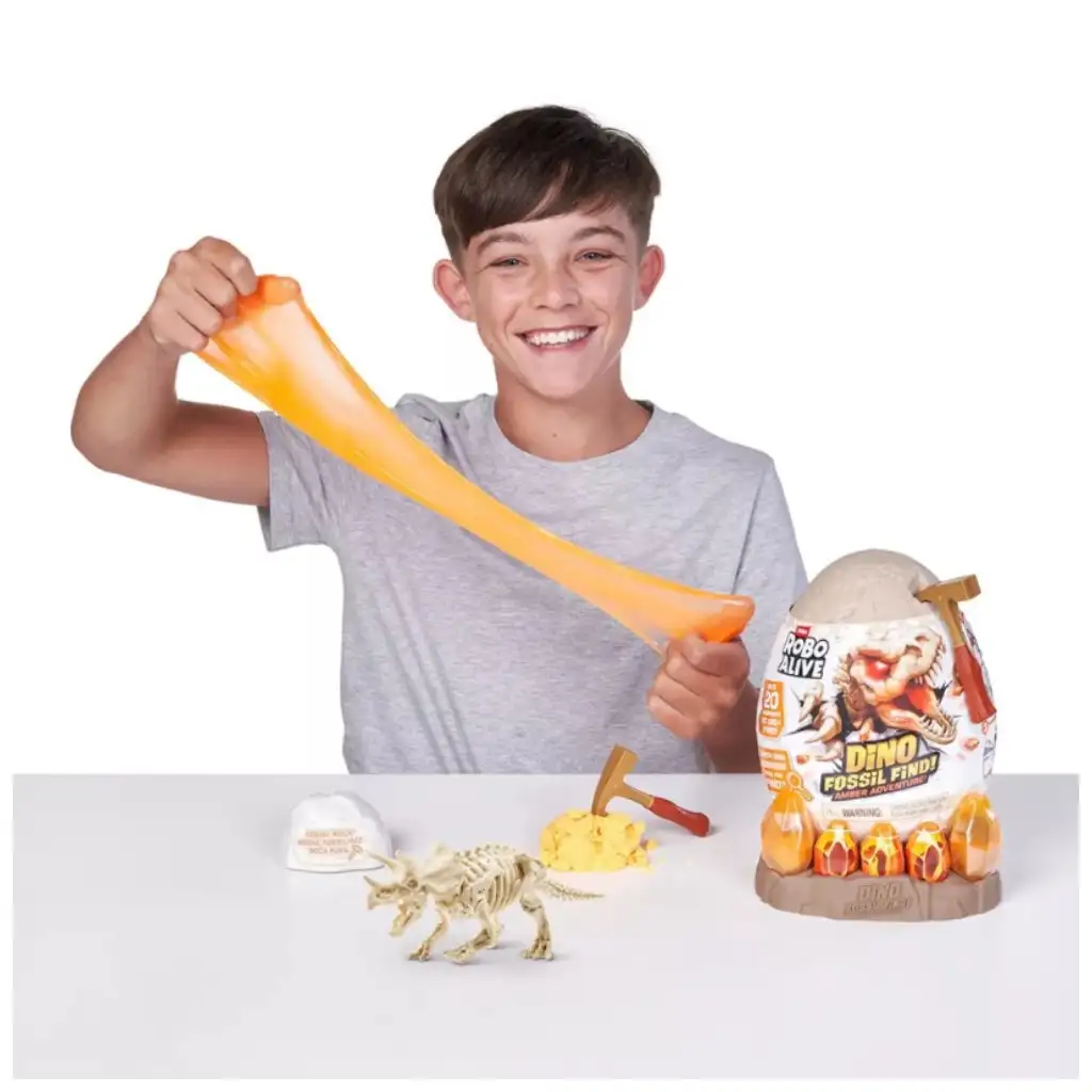 Objev tajemství minulosti se sadou Robo Alive dinosauří fosilie – Jantarové dobrodružství! Připrav se na vzrušující vykopávky, během kterých se musíš probojovat přes vrstvy hornin a písku, než odhalíš starověké pozůstatky dinosaurů. Sliz-láva dodává dobrodružství speciální nádech – svítí, natahuje se a činí objevování ještě zábavnějším.
