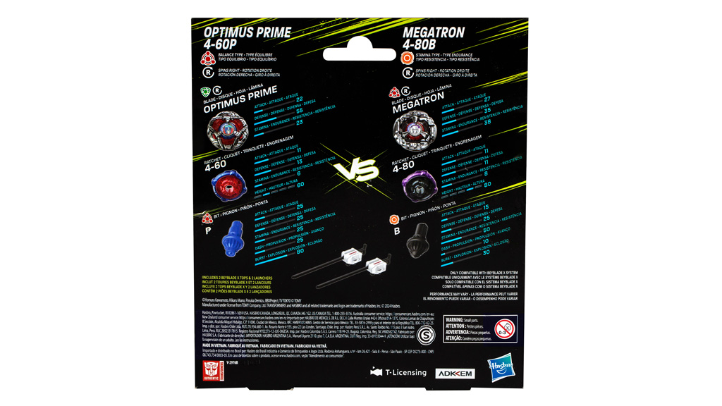 Druhý multipack, BEYBLADE x Transformers Optimus Prime 4-60P vs. Megatron 4-80B Multipack Set, obsahuje dva pravotočivé rotory s obrázky Optimus Prime a Megatron. Balení obsahuje také dva bílé startéry s názvem Transformers.Děti mohou přímo začít bitvu s jakoukoli sadou nebo mohou přeměnit vyměnitelné čepele, ráčny a bity točivých vršků s jinými točivými vršky BEYBLADE X. Originální kovové točivé vršky BEYBLADE X od Takara Tomy obsahují systém X-Celerator Gear. Beystadia nejsou součástí žádné sady, ale lze je zakoupit samostatně.
