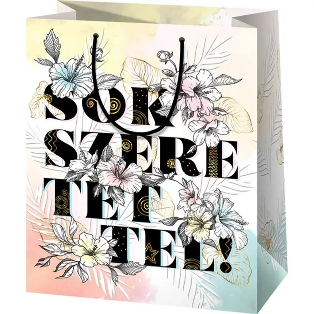 Tato "S láskou!" velká exkluzivní dárková taška o rozměrech 27x14x33 cm je elegantní a upoutávající balení pro speciální dárky. Taška je zdobena čistě bílým podkladem s květinovými motivy a zlatými detaily, což předává výrazný a intimní vzkaz, ideální pro obdarování milovaných osob. Kombinace moderních a klasických prvků vyhovuje mužům i ženám, mladým i starším. Taška je vyrobena z kvalitního kartonového materiálu, který zajišťuje trvanlivost a ochranu dárků, a uši usnadňují snadnou přepravu.