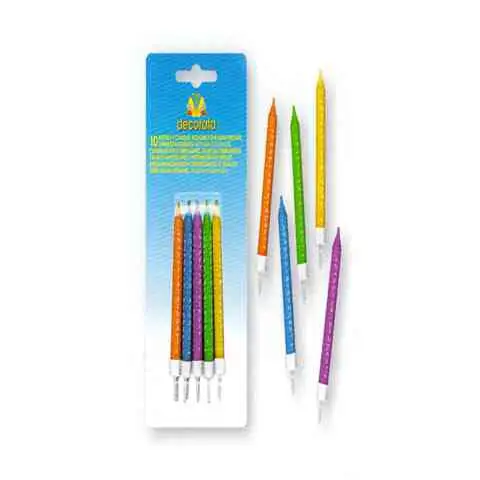 Bez narozeninové svíčky není opravdový dort. Tyto jednoduché, barevné svíčky jsou určeny pro dorty lidí, kteří rádi slaví decentně. Na svíčkách je nenápadně vytištěn nápis Happy Birthday. Barvy svíček jsou dostatečně rozmanité, najdete zde oranžovou, citronově žlutou, zelenou, modrou a fialovou. Na spodní části svíčky je plastový podstavec, kterým lze snadno připevnit na dort.