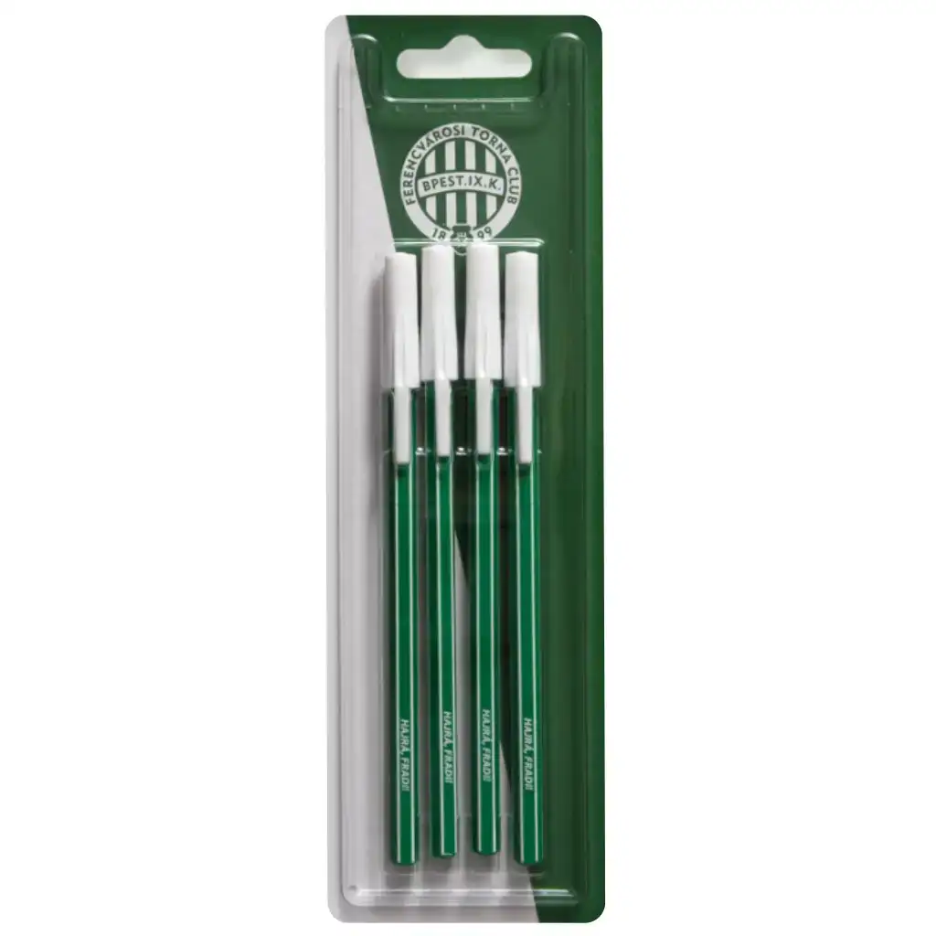 Sada 4 ks propisek Fradi je skutečným základem pro každého fanouška Fradi do penálu! Zelené propisky jsou opatřeny nápisem „Hajrá Fradi!“, takže jsou nejen praktické, ale i motivující pro každodenní školní nebo domácí psaní. Propisky s víčkem spolehlivě uzavírají, takže se v tašce nerozmazávají. Díky lehkému psaní jsou ideální pro poznámky, domácí úkoly nebo dokonce kreativní psaní. Perfektní volba pro všechny věkové kategorie, kteří chtějí ukázat svou vášeň pro Fradi i v každodenním životě.