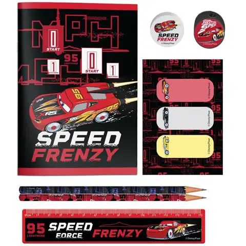 Autíčka jsou jednou z nejúspěšnějších Disneyových pohádek poslední doby, která byla primárně určena pro chlapecké publikum a malí kluci dodnes obdivují auto s číslem 95, Blesk McQueen, které vyhrálo mnoho závodů Pístového poháru. Balení psacích potřeb pro školu obsahuje také užitečné doplňky, takže kromě dvou tužek najdeme také gumu a ořezávátko, aby byly tužky vždy připraveny k použití a aby bylo možné okamžitě opravit případné chyby. Kromě toho najdeme pravítko, malý sešit a další užitečné věci v praktickém PVC sáčku, který lze také použít jako penál.