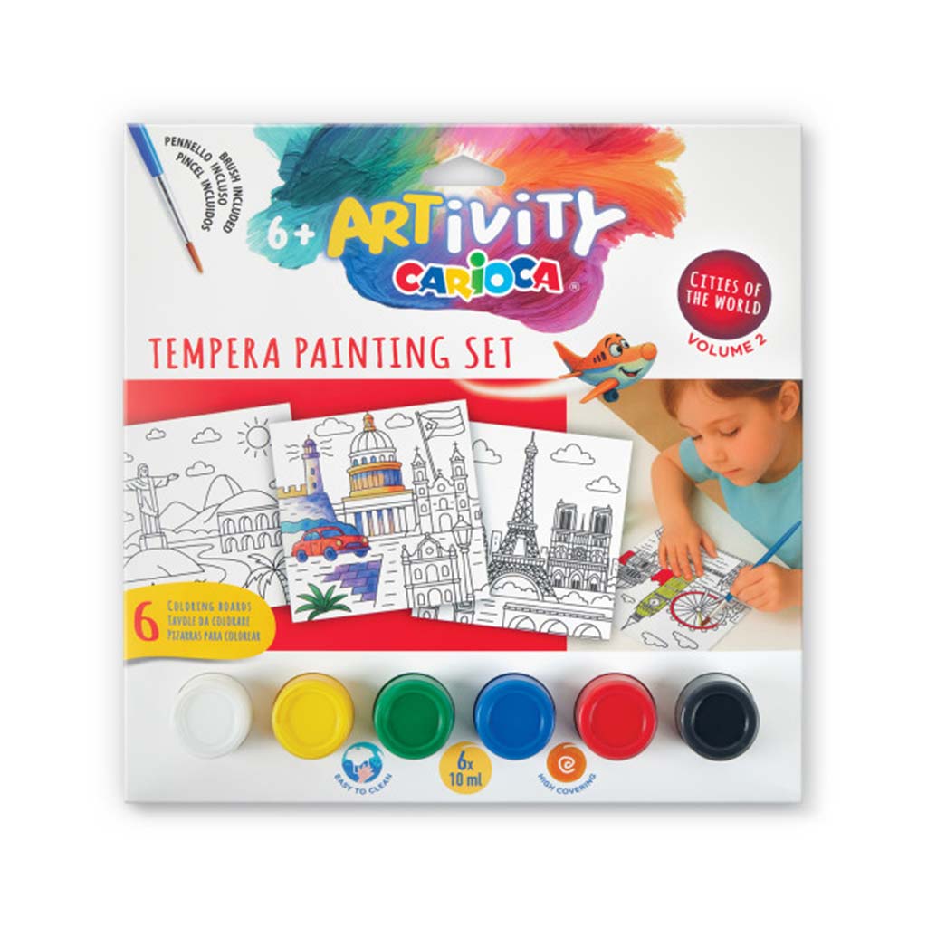 Sada temperových barev ARTivity Carioca – s tématem Evropy – je skvělou volbou, pokud chcete rozvíjet kreativitu svého dítěte, zatímco se hravě seznamuje se slavnými místy světa. Druhý díl série „Cities of the World“ představuje evropské památky, takže děti při malování mohou objevovat mimo jiné Eiffelovu věž nebo jiné ikonické stavby. Předtištěné obrázky podporují pocit úspěchu, takže vaše dítě může snadno vytvořit hezké, barevné obrázky.