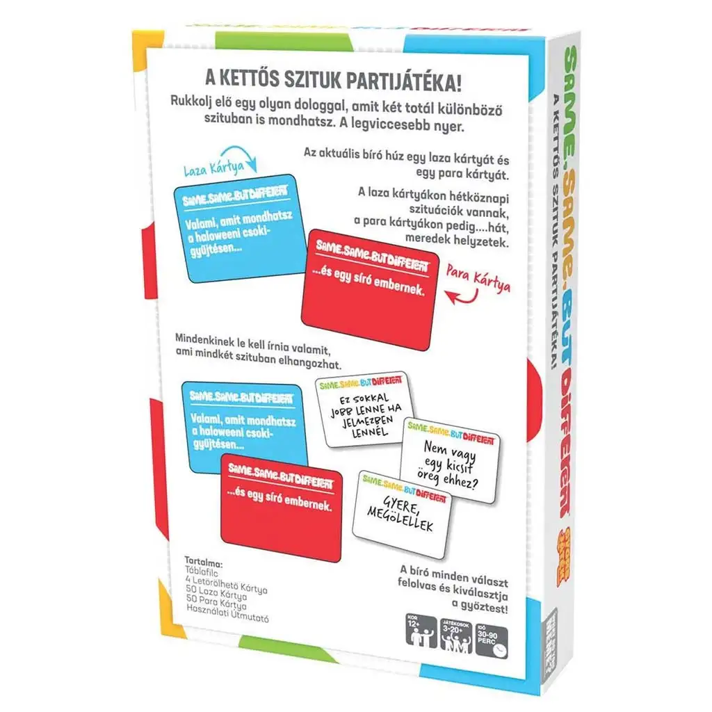 Tato hra je skutečný zásah do černého na každou párty nebo přátelské setkání, kde je hlavním mottem smích a kreativita. Znáte tu situaci, kdy vyslovíte větu a uvědomíte si, že by v úplně jiné situaci znamenala něco úplně jiného? Přesně toto vtipné poznání vám přinese společenská hra Same Same but Different! Cílem je vymyslet větu, která by obstála ve dvou zcela rozdílných situacích – a samozřejmě, čím vtipnější, tím lepší!