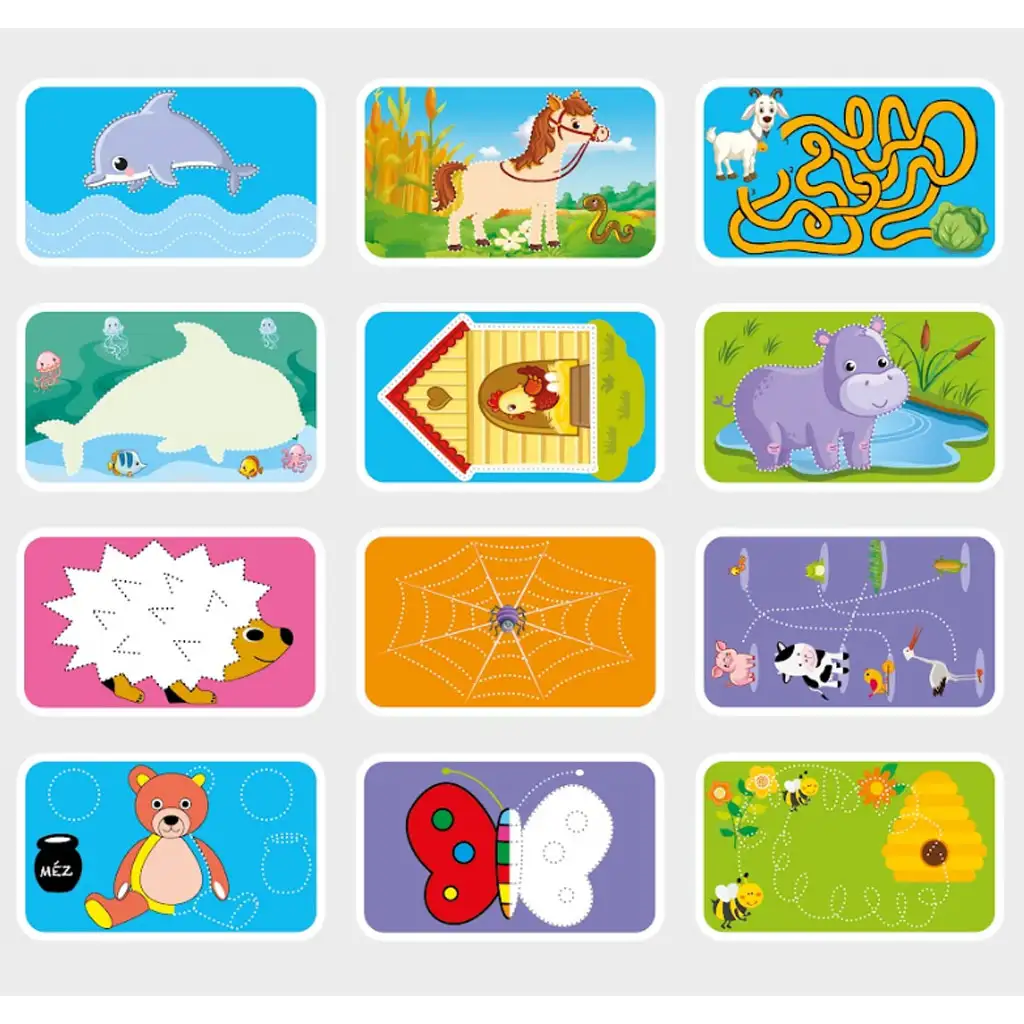 Balíček obsahuje 12 oboustranných karet, na kterých na děti čekají různé zvířecí úkoly. Mezi úkoly najdete cvičení na vedení čar, bludiště, spojování bodů a doplňování vzorů. Karty jsou stíratelné, takže s přiloženým fixem lze úkoly řešit znovu a znovu, což zajišťuje možnost neustálého procvičování a učení.