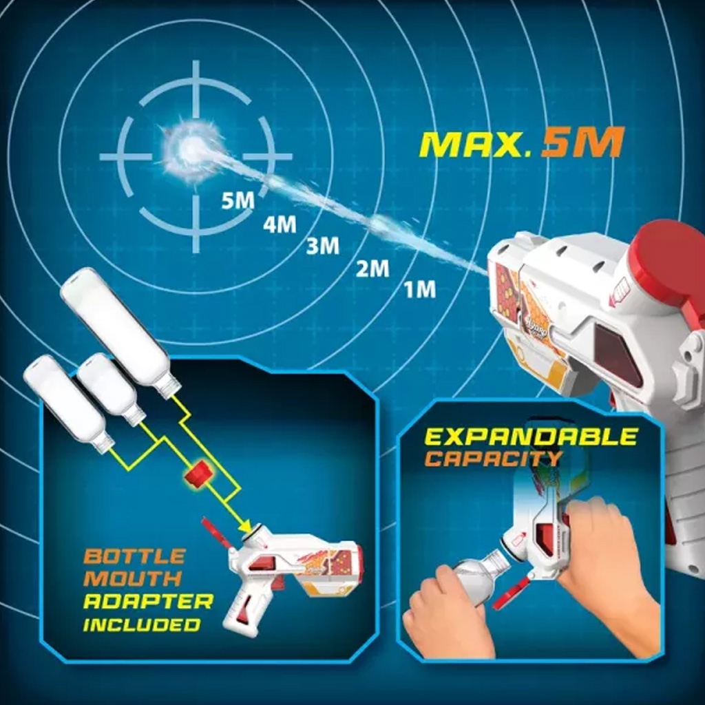 Praktický adaptér pro připojení lahve umožňuje připojit lahve různých velikostí, takže kapacita nádržky se dá podle potřeby zvětšit. To je obzvlášť užitečné při delší hře, kdy nechcete tak často doplňovat vodu. Lehký, ergonomický tvar zajišťuje pevný úchop, takže děti ji mohou pohodlně používat i delší dobu.