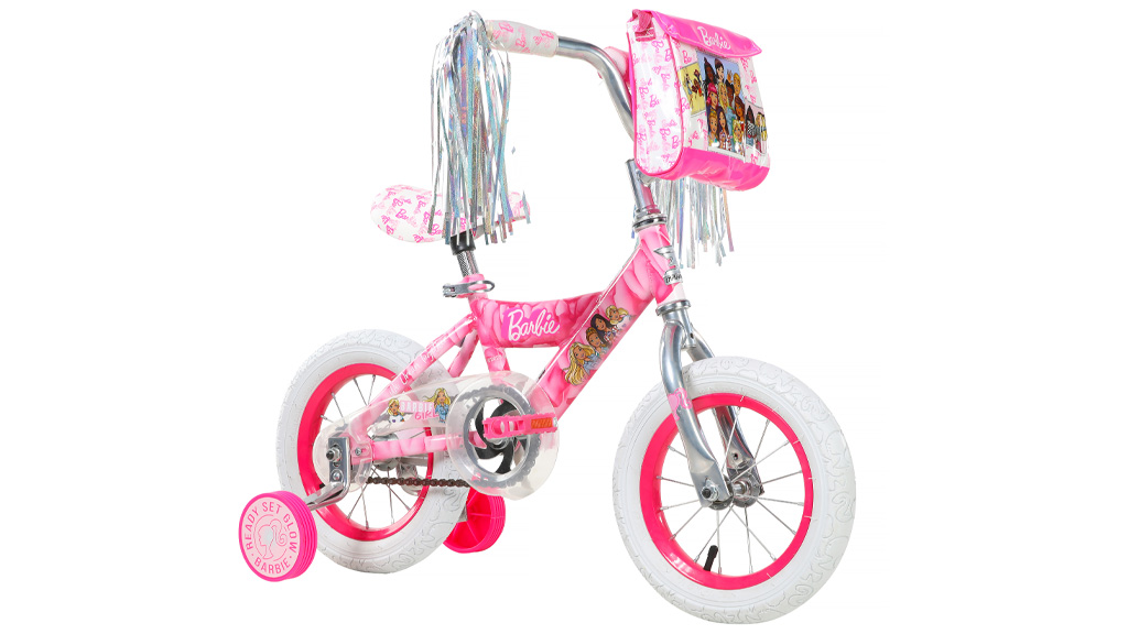 Tento růžový, 12palcový bicykl obsahuje protišlapací brzdy, nastavitelnou sedlovku a pomocná kolečka! Bicykl má motiv Barbie na sedle a řídítkách a obsahuje také řídítkovou tašku s obrázkem Barbie a jejích přátel.