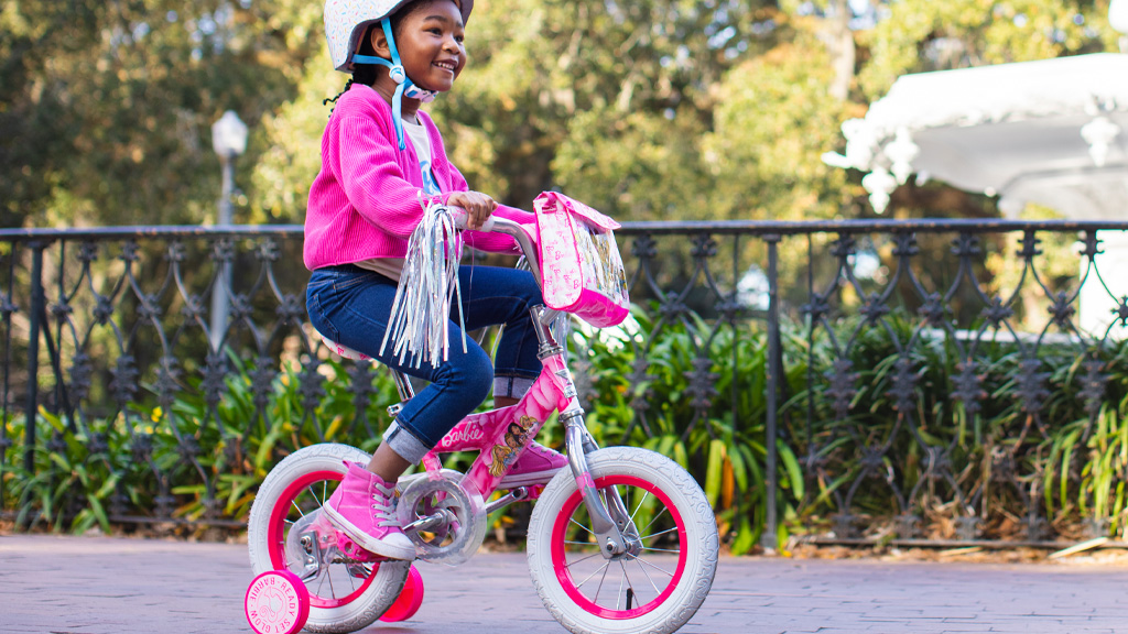 Růžovo-bílý bicykl s odnímatelnými přídavnými kolečky, ocelovým rámem BMX a ikonickou taškou na řídítka s postavami Barbie je bezpečný a stylový! Bicykl je dále vybaven kovově lesklými stuhami a ikonami s tématikou Barbie.