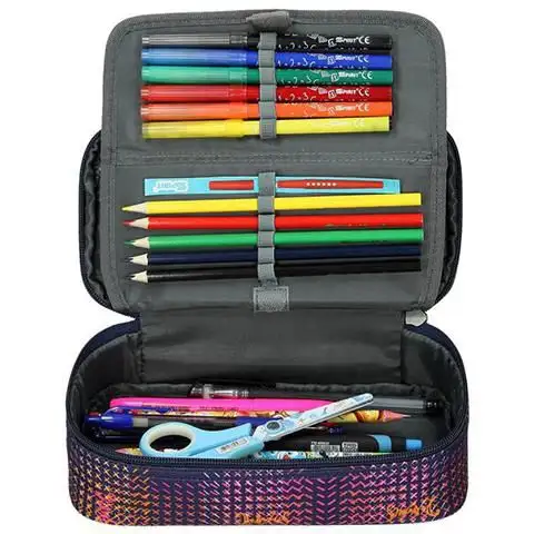 Fialová barva pouzdra na psací potřeby je zdobena různými módními barvami, které společně vytvářejí okouzlující vzhled odolného pouzdra Spirit. Jedinečný vzor a harmonie barevné palety zdůrazňují exkluzivní a módní charakter pouzdra. Jednokomorová konstrukce a vyklápěcí klapka jsou výsledkem praktického a chytrého designu, který umožňuje uložení mnoha psacích potřeb. Kromě základních prvků psací kolekce pouzdro snadno pojme také barevné tužky a fixy, které může vaše dítě potřebovat během školních povinností.