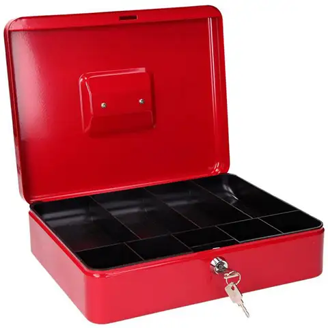 Pořiďte si červenou pokladničku vyrobenou z kvalitního kovu, ve které můžete bezpečně uchovávat peníze jak v kanceláři, tak v domácnosti. Díky plastové peněžní vložce uvnitř můžete snadno třídit bankovky a mince. Pokladnička je uzamykatelná a díky pevnému kovovému materiálu k ní má přístup pouze ten, kdo má klíč. Pokladnička je také vybavena nosným pouzdrem pro snadnou přepravu.