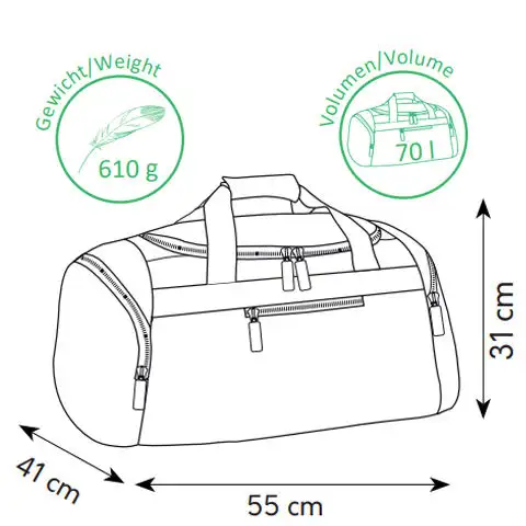 Povrch sportovní tašky v jasně modré barvě zdobí neónově zelené pruhy a skvělá harmonie obou barev dává vašemu dítěti opravdu módní vzhled při odpoledních trénincích. Ve svém velkém objemu 70 litrů může vaše dítě vzít všechny potřebné věci na trénink, ať už jde o náhradní oblečení, náhradní boty nebo jiné sportovní vybavení. Taška je vyrobena z pevného a odolného materiálu, aby dobře snášela aktivní použití, a díky svým vodoodpudivým vlastnostem udržuje vnitřní vybavení suché i v dešti. Nakonec, ale rozhodně ne poslední, tašku lze nosit jak v ruce, tak na rameni.