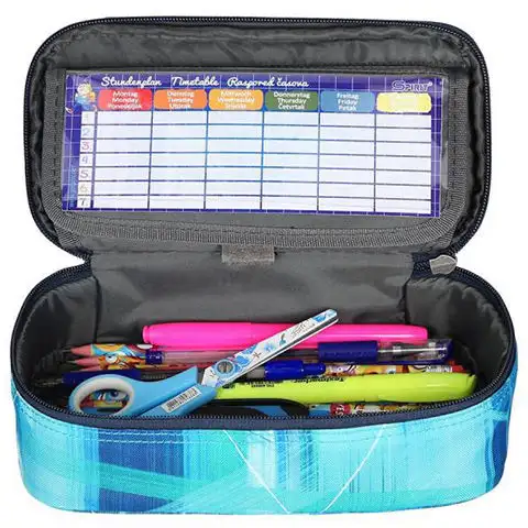 Na povrchu pouzdra na tužky Spirit s černým zipem dominují světle a tmavě modrá barva, zdobená bílými pruhy, které dávají vašemu dítěti opravdu módní vzhled během školních studií. V pouzdru na tužky se vejde spousta psacích potřeb, kromě základních nástrojů může dítě s sebou vzít i kružítko, pravítko nebo papírový nůž. Uvnitř pouzdra na tužky je také průhledná část, ve které může vaše dítě uchovávat rozvrh hodin nebo důležité poznámky a lístečky během školních let.