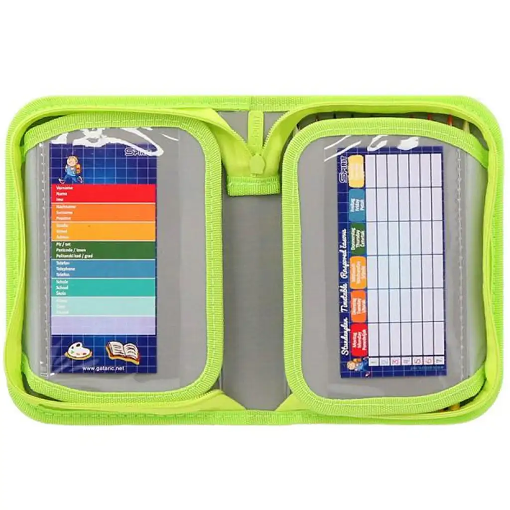 Obsahuje: tužky, barevné tužky, fixy, pryž, ořezávátko, pravítko, trojúhelník, jmenovka, rozvrh hodin