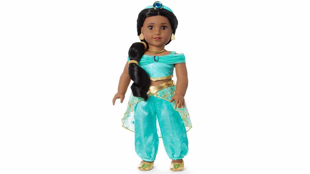 Tato panenka American Girl je zářivá, třpytivá a okouzlující. Pro svůj královský debut má Jasmína na sobě duhový, foliový top a saténové kalhoty, ke kterým patří zdobená, našitá sukně. Vzhled princezny z Agrabah doplňuje třpytivá tyrkysová čelenka, špičaté pantoflíčky, zlaté doplňky a dva zlaté gumičky do vlasů.