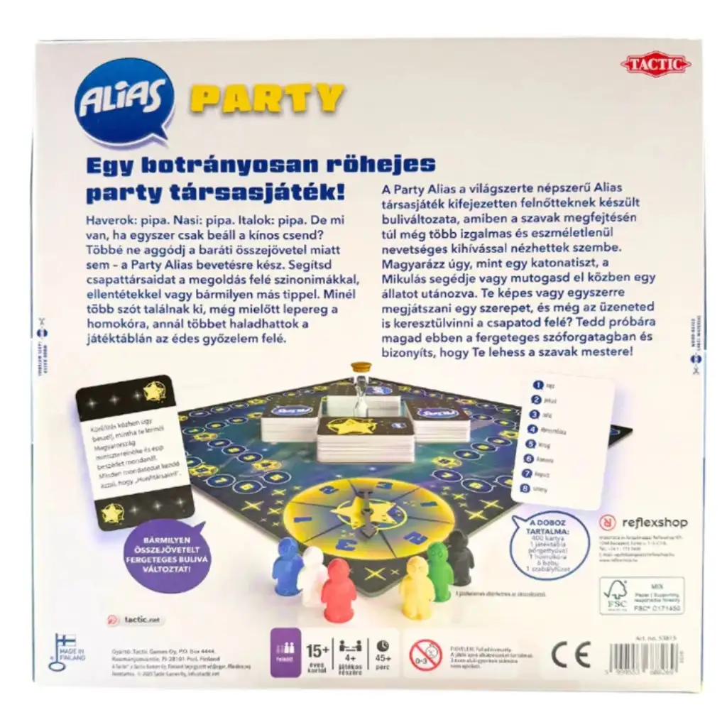 Základní pravidlo je stejné jako u Original Alias, tedy musíte svému partnerovi pomoci uhodnout slovo na vaší kartě pouze pomocí slov! Ve verzi Party však kromě popisu dostanete ještě jeden úkol, takže během hry musíte mluvit s neobvyklými pokyny, například jako sportovní komentátor nebo jako robot. Dokážete si představit, že byste vysvětlili slovo jako výcvikový důstojník, zlý skřítek nebo jako byste byli nějaké zvíře. Party Alias je oceněná společenská hra s úžasnými výzvami! Buďte kreativní a vysvětlete slova na kartách bez jejich vyslovení! Použijte synonyma, antonyma nebo je popište jiným slovem! Uhodněte co nejvíce slov, než poslední zrnko v hodinách spadne! Dostaňte se do cíle jako první!
