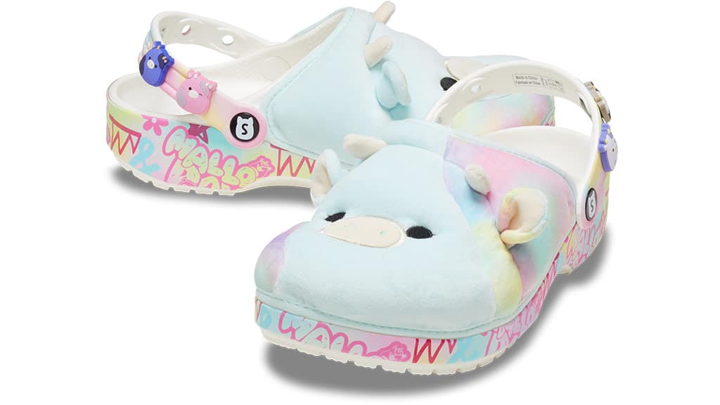 Udržujte své nohy v teple a pohodlí s Crocs s motivem Squishmallows! Tato kolekce obsahuje Jibbitz, pár klasických dřeváků ve velikostech pro dospělé a děti, pár sandálů Cozzzy s motivem kočky Cam a pár dřeváků inspirovaných Caedií.