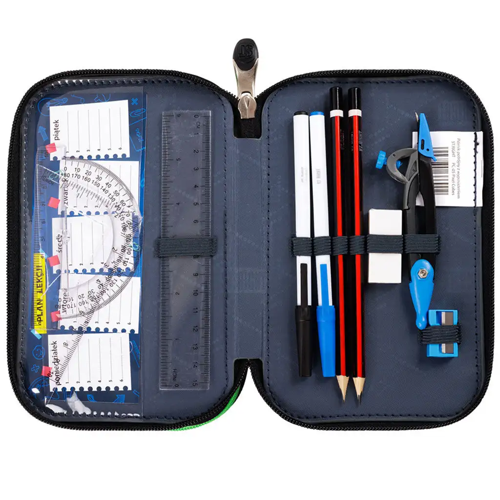 Bohatý obsah penálu zaručuje, že všechny potřebné školní pomůcky budou po ruce. Obsahuje 9 fixů, 9 barevných tužek, kružítko, ořezávátko, gumu, 2 tužky, 2 pera, pravítko a rozvrh hodin. Tyto pomůcky jsou vhodné pro všechny školní úkoly a kreativní činnosti.