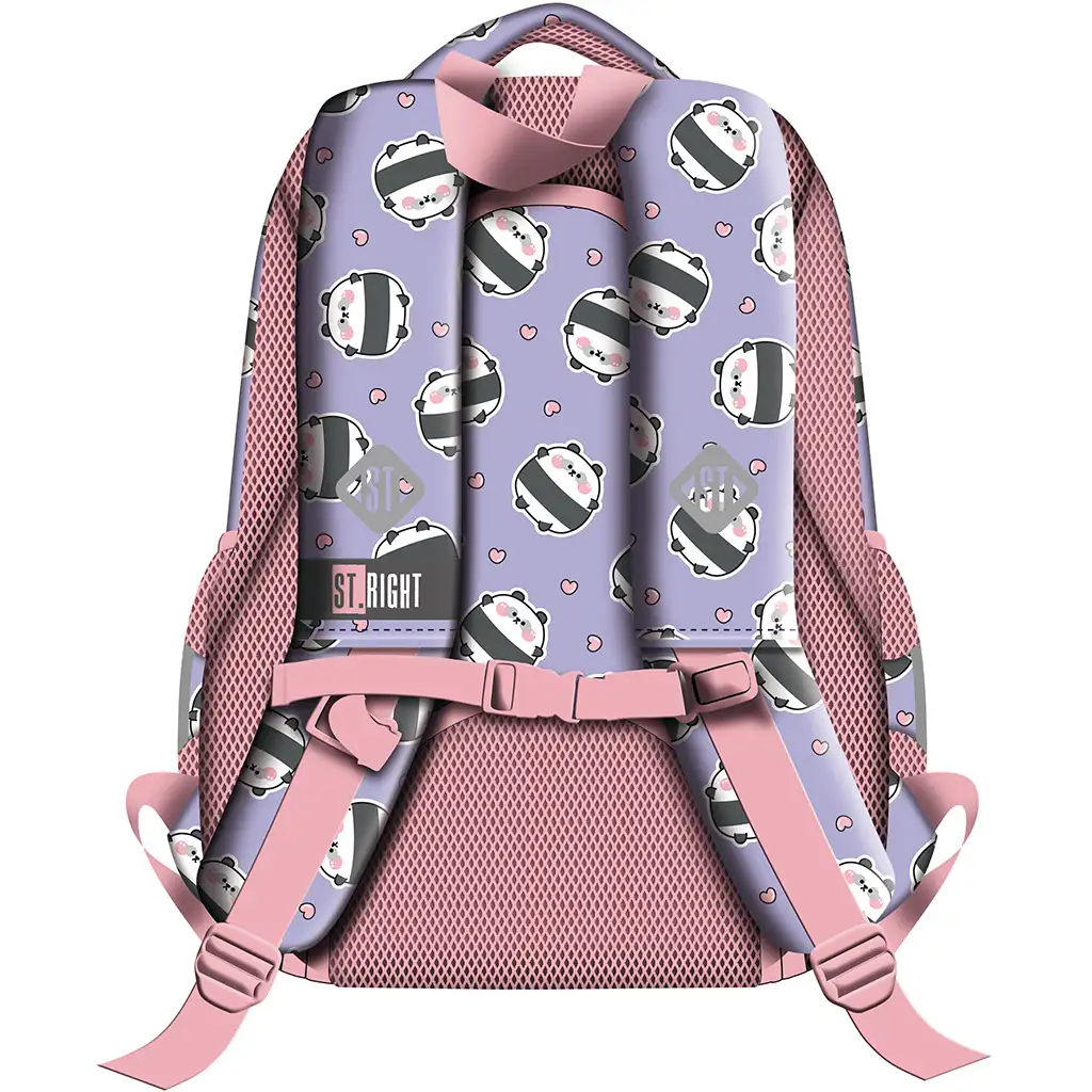 Školní batoh St.Right Happy Panda BP26 je perfektní volbou, pokud vaše dítě miluje roztomilé vzory a veselý, barevný design! Světle fialový základ zdobí roztomilé pandy a růžová srdíčka, což zaručeně vykouzlí úsměv na tváři každého. Přední část batohu ozvláštňuje měkký růžový přívěsek-pompom, který si vaše dítě zamiluje.