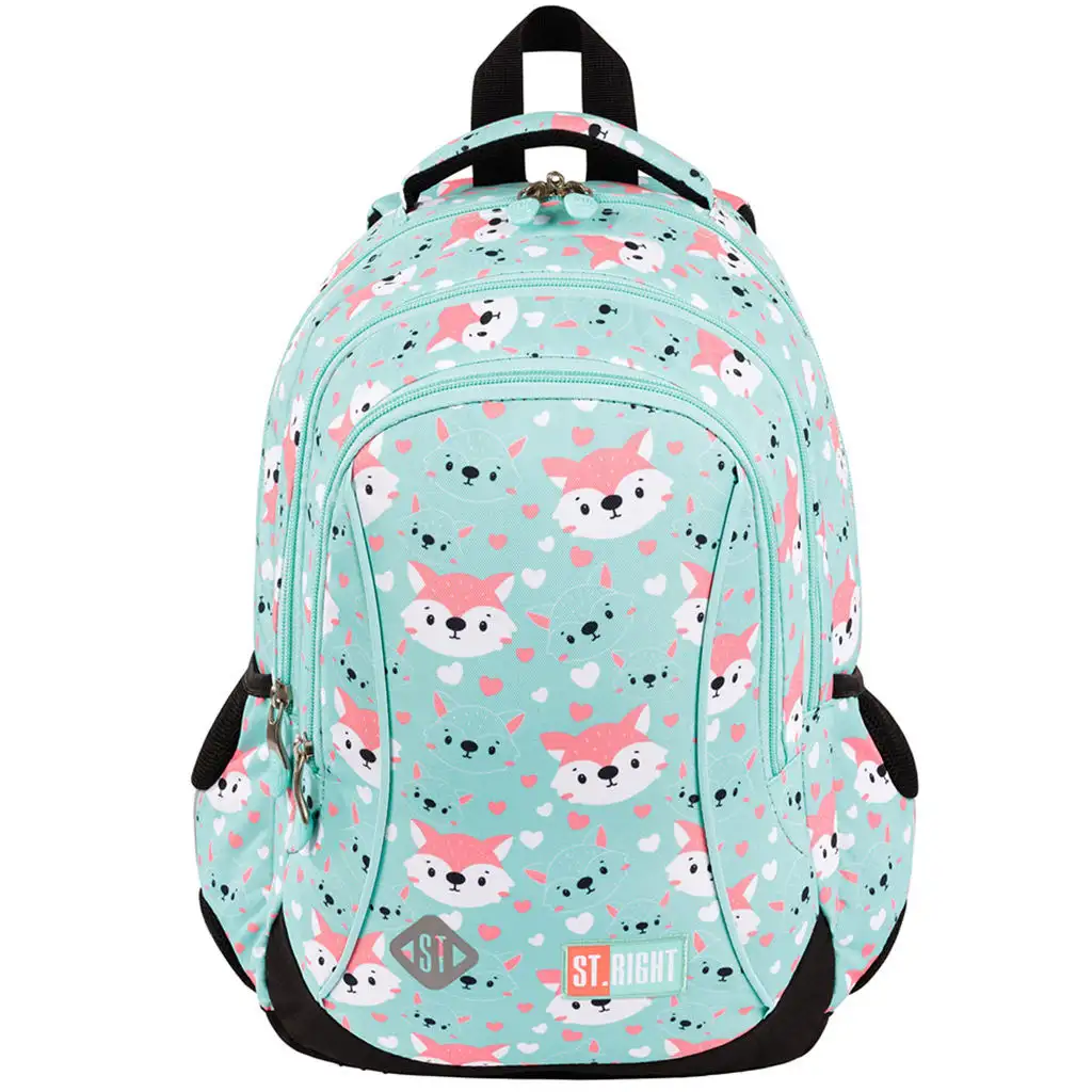 St. Right Lovely Foxy školní batoh BP26 je stylová a praktická volba pro každého studenta. Světle modrý podklad s roztomilým motivem lišky je nejen estetický, ale také poutavý. Batoh má tři prostorné komory, které poskytují dostatek místa pro knihy, sešity a další školní potřeby. Kromě toho má dvě boční elastické vnější kapsy, které jsou ideální pro láhve nebo menší předměty.