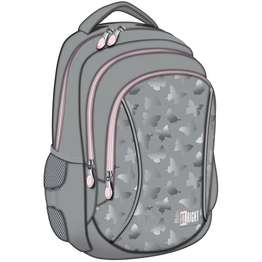 St.Right Silver Butterfly tříkomorový školní batoh BP26 je perfektní volbou, pokud hledáte elegantní, a přitom praktický a pohodlný školní batoh pro své dítě! Stylový šedý základní odstín a jemně třpytivé motivy motýlů dodávají tomuto batohu skutečně moderní vzhled. Decentní růžové zipy přidávají nádech jemné ženskosti, takže je tento batoh obzvlášť oblíbený mezi dívkami.
