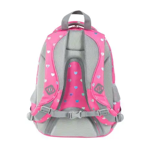 St.Right Sequin je velmi speciální taška díky srdci z kamínků na přední straně. Přejetím přes srdce se kamínky změní z jednobarevných kruhů na stříbrnou barvu a uprostřed obrázku se objeví zamilovaný pár koček. Taška je po obvodu zdobena menšími srdíčky. Výběr kvalitního materiálu a ergonomický design jsou u tohoto batohu jen začátek, protože je vybaven takovými funkcemi, jako je výstup pro sluchátka nebo držák na klíče. Vícekomorová konstrukce umožňuje přehledné a pohodlné třídění školních potřeb a usnadňuje balení a vybalování. Ramenní popruhy jsou polstrované a nastavitelné, zpevněná zadní část má navíc ventilační kanály.