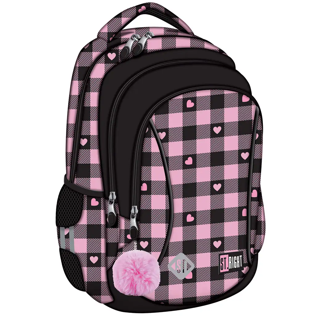 St.Right Pink-Black Heart školní batoh BP26 je opravdu okouzlující volbou pro každou školní dívku, která má ráda roztomilé a zároveň praktické doplňky! Růžovo-černý kostkovaný vzor zdobí drobná srdíčka, která dávají batohu veselý a originální vzhled. Měkký růžový přívěsek ve tvaru bambulky na přední straně ještě více zvýrazňuje hravost a módnost tohoto školního batohu.