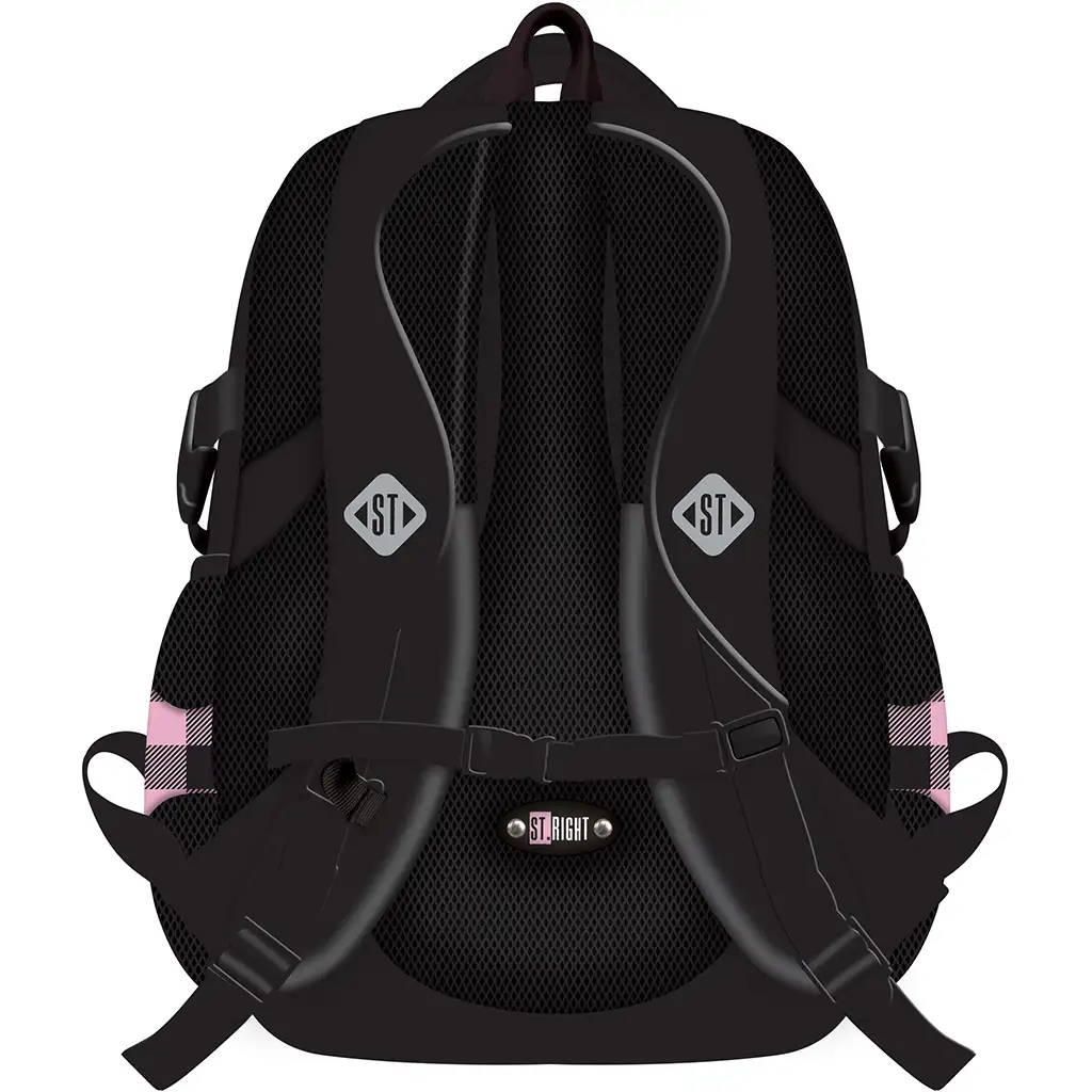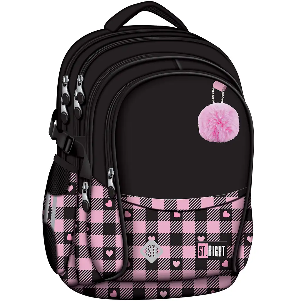 Školní batoh St.Right Pink-Black Heart BP01 je opravdu stylová a praktická volba pro každou školačku, která miluje roztomilý a jedinečný vzhled! Růžovo-černý kostkovaný vzor ozdobený malými srdíčky a chlupatý růžový přívěsek na přední straně dodávají batohu půvabný vzhled, takže vaše dítě ho bude s radostí nosit každý den.