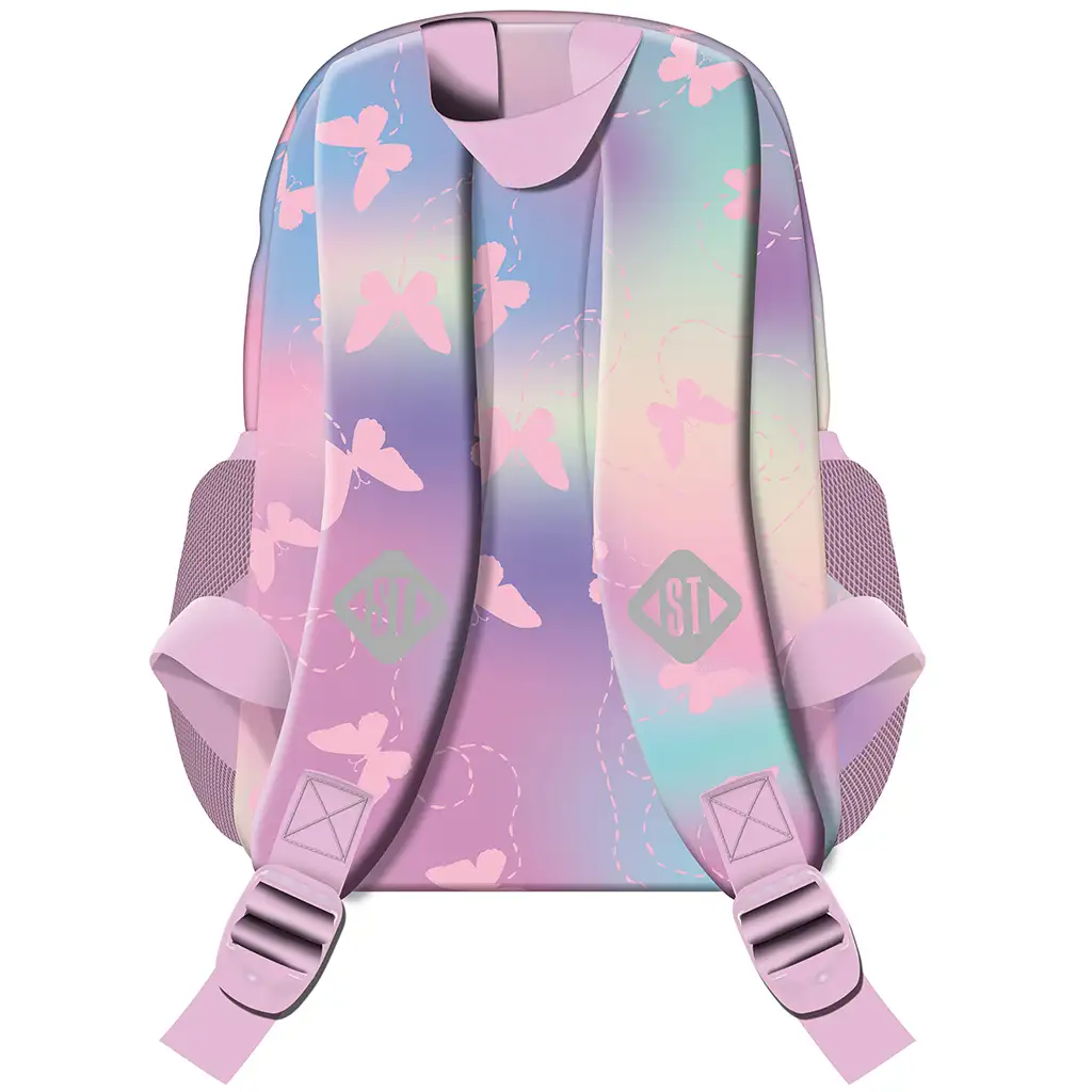 St.Right školní batoh s růžovými motýly BP70 je nádhernou volbou pro každou holčičku, která má ráda jemné, kouzelné barvy a roztomilé vzory. Batoh je v růžových a pastelových odstínech s přechodovým designem, který je zdobený jemnými motivy motýlů a drobnými kresbami, jež vyzařují hravý a pohádkový nádech. Světlé růžové detaily, jako jsou zipy a ramenní popruhy, ještě více zvýrazňují roztomilost batohu.