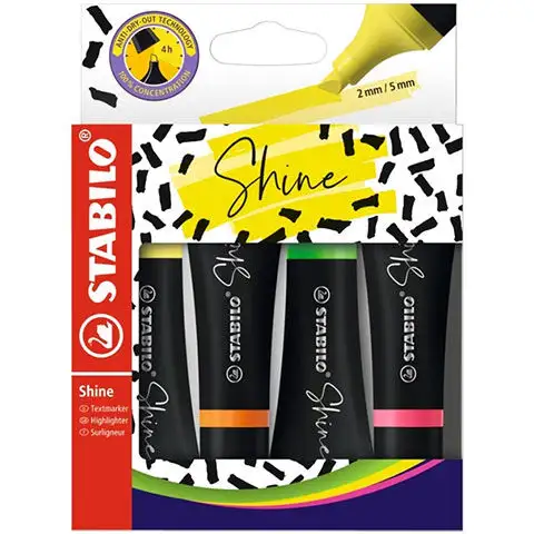 Tato čtyřdílná sada zvýrazňovačů je skvělou volbou z každého hlediska, protože s různými barvami můžeme vytvářet kategorie a speciální Shine design zaručuje výrazný vzhled sady. Zvýrazňovače mají odolné šikmé hroty, které umožňují různé šířky čar, takže jsou vhodné pro psaní i podtrhávání stejně jako pro zvýrazňování textu. Díky povrchu softgrip pro pohodlné držení a ochraně proti vysychání po dobu čtyř hodin není soustředěná práce po hodiny problém.