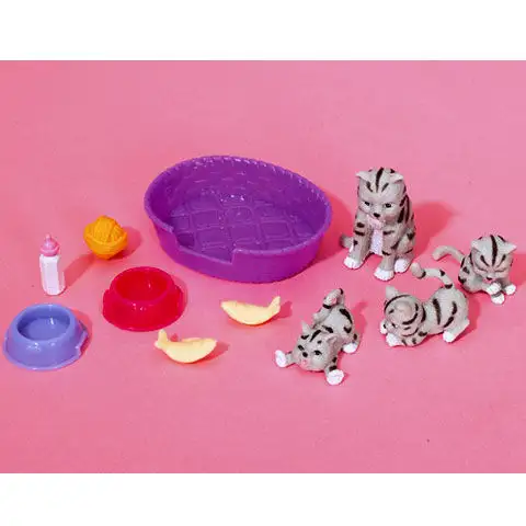 Obsah balení: 1 panenka, 4 zvířátka, láhev s dudlíkem, misky na krmení, míč a maso pro zvířátka.