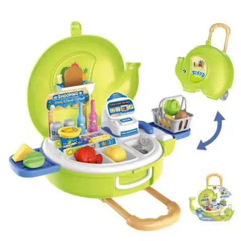Tento roztomilý vozík s domkem ve tvaru slona skrývá spoustu vzrušujících věcí, protože když ho otevřete, objeví se před dětmi opravdový supermarket. Souprava obsahuje pokladnu, nákupní košík a spoustu zboží, které si mohou děti koupit. Ukládání a přeprava sady je velmi jednoduché díky vynalézavému designu s kolečky na kufru.