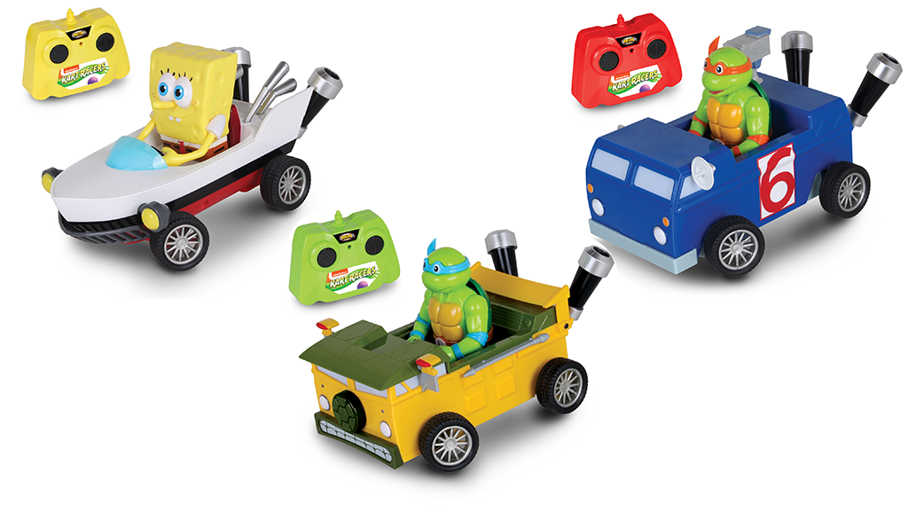 Postavy a vozidla jsou založeny na závodní videohře Nickelodeon Kart Racers. Závoďte se svými oblíbenými postavami z Nickelodeonu! Mezi možnosti patří SpongeBob v Boatmobile, Leonardo (TMNT) v Party Wagon a Michelangelo (TMNT) v Channel Six News Wagon. Rádiové ovládání na frekvenci 2,4 GHz umožňuje hrát až 16 závodníkům najednou. Hra poskytuje vzrušující a zábavný zážitek pro všechny věkové kategorie a je ideální volbou pro rodinná setkání nebo přátelské závody.