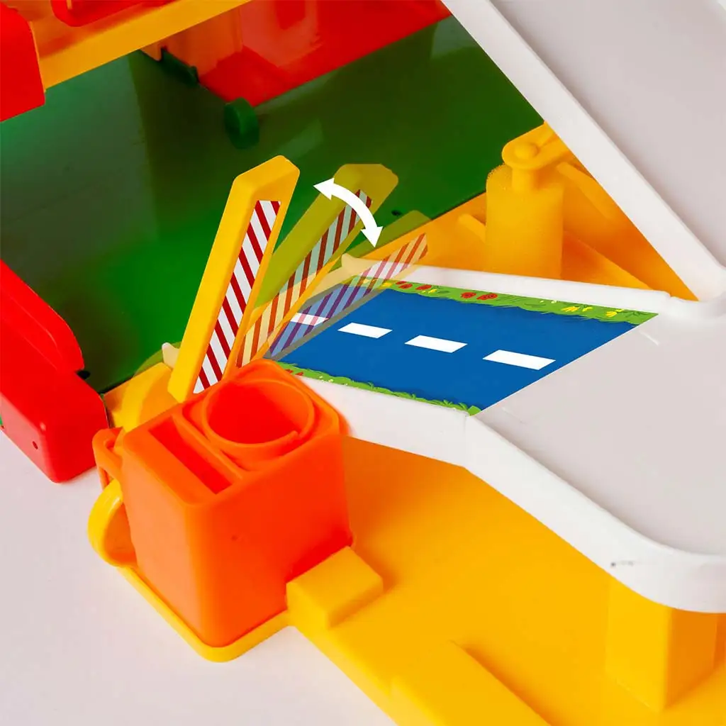 Pomocí pohyblivého výtahu lze vozidla snadno dostat do vyšších pater, odkud mohou sjet po rampě dolů. Sada obsahuje také cca 1,5 metru dlouhou silnici, která zajišťuje ještě pestřejší zážitek ze hry a umožňuje vytvořit si vlastní městskou dráhu. Závora, čerpací stanice a další doplňky ještě více umocňují realistický zážitek, zatímco díky samolepkám si děti mohou garáž ozdobit podle své fantazie.