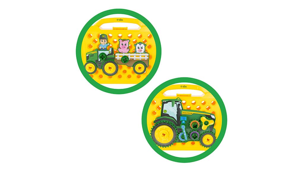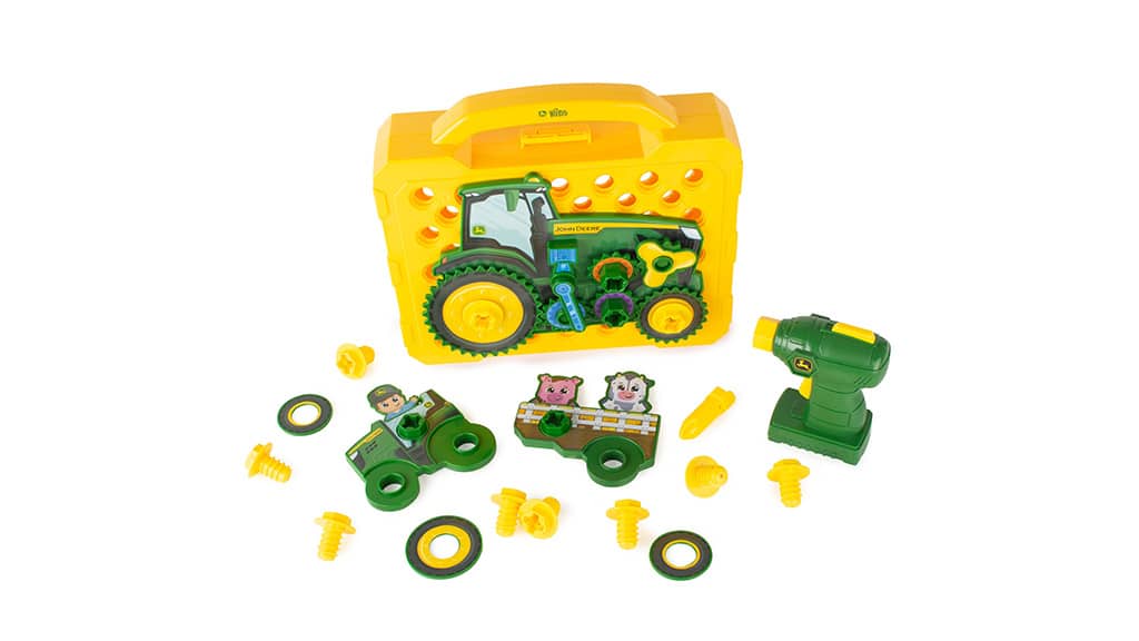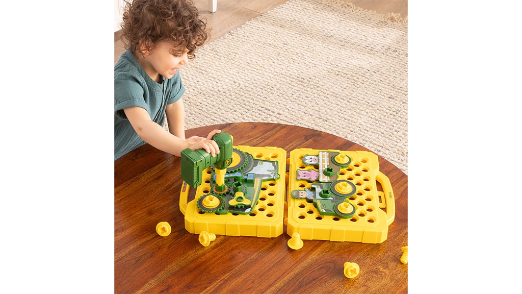 Společnost TOMY přináší zážitek z farmy do dětského pokoje s hračkou John Deere Build-A-Buddy Activity Board! Tato herní sada umožňuje dětem od 18 měsíců a starším postavit dvě různé farmářské scény s traktory pomocí barevných šroubů, matic, kol a traktorových dílů. S dětskou vrtačkou mohou malí pohybovat figurkami na traktorech, včetně farmáře, krávy a prasátka, nahoru a dolů. Herní deska leží naplocho a má dvě strany, takže si s ní lze hrát různými způsoby. Děti mohou ozdobit kola a traktorové díly přiloženými samolepkami, postavit a vyzkoušet si vlastní farmu. Tato hračka nejen rozvíjí kreativitu a jemnou motoriku, ale také poskytuje hodiny zábavy pro nejmenší!