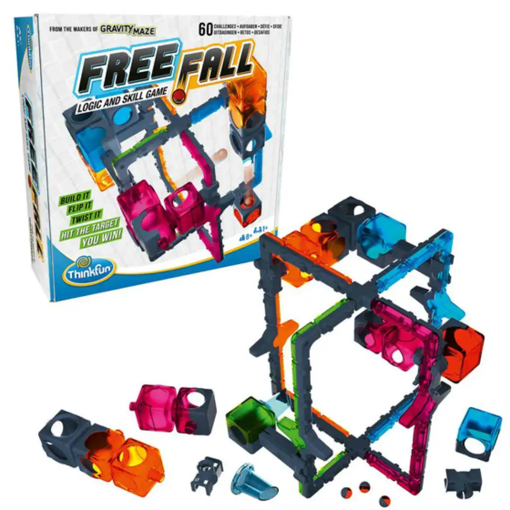 Objevte hru Free Fall od ThinkFun, vzrušující gravitační puzzle hru, která představuje skutečnou výzvu v prostorové logice a dovednostech! Hráči musí postavit duhovou dráhu s použitím rámu, poté ji obratně otáčet tak, aby míček spadl gravitací správnými tunely až do cílové oblasti. 60 úkolů, které sahají od začátečníka po experta, krok za krokem provádějí hráče poznáním hry s gravitací.