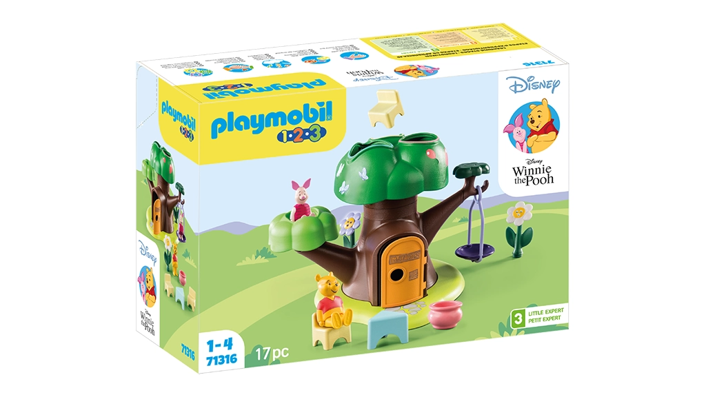 Děti si mohou rozvíjet jemnou motoriku umisťováním postaviček a předmětů, otáčením a pohybem dřevěných prvků a houpačky, otevíráním a zavíráním dveří a sázením květin v této stavebnici inspirované Medvídkem Pú. Uspořádejte předměty do otvorů na vrcholu stromu a sledujte, jak se vrací zpět...