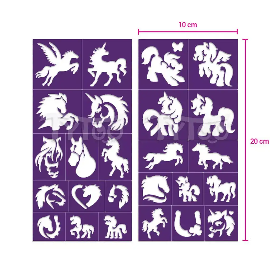 Šablony lze jednoduše nalepit na kůži a poté vyplnit třpytkami nebo tělovými barvami. Motiv se krásně vykreslí a na kůži vydrží i několik dní. Na šablonách najdete všechny možné styly: roztomilé kreslené poníky, elegantní koňské hlavy, klusající koně i výjimečné okřídlené bytosti, takže si každý malý milovník koní najde svého oblíbence. Lepicí zadní strana zajišťuje dobrou přilnavost, ale šablonu lze snadno odstranit z kůže, použití je tedy dětsky jednoduché.