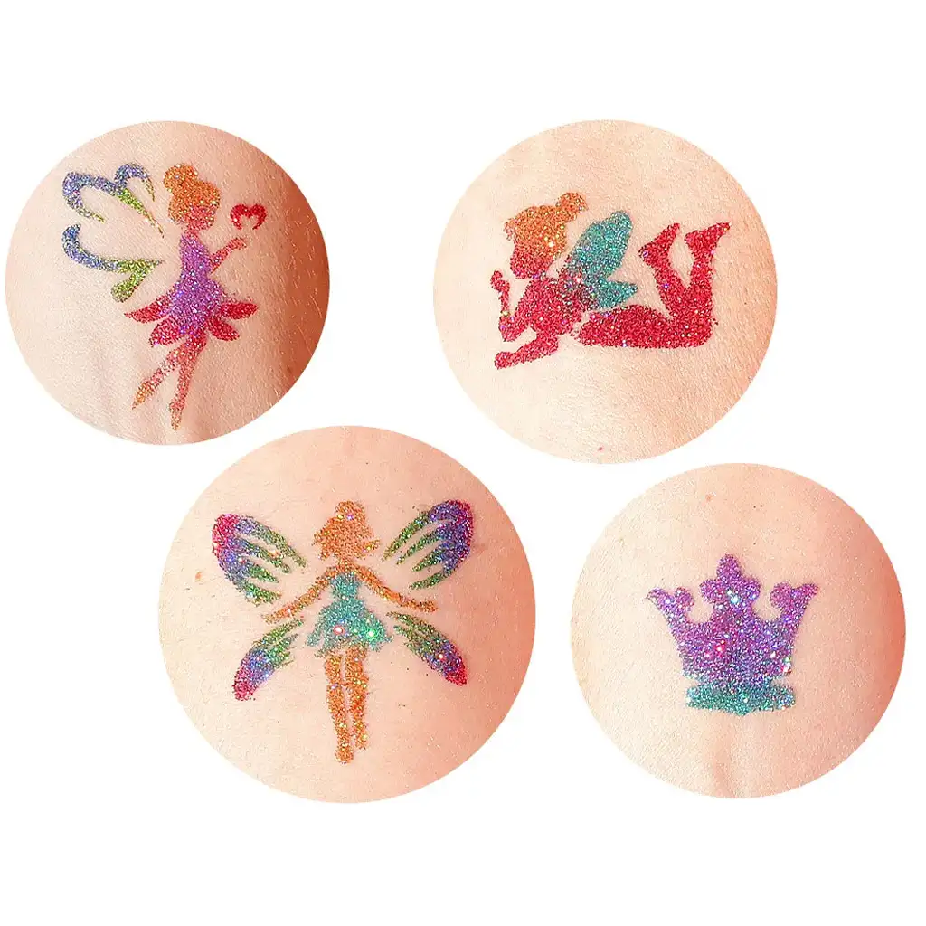 Tato sada šablon je ideální volbou pro všechny malé snílky, kteří se rádi schovávají za třpytivá vílí křídla nebo se vžívají do role pohádkové princezny. Samolepicí šablony lze snadno připevnit na pokožku a spolu s třpytkami nebo barvami na tělo můžete vytvořit opravdu nápaditá, barevná a třpytivá tetování. Lepidlo dobře drží, ale nedráždí pokožku, takže je bezpečné i pro menší děti.