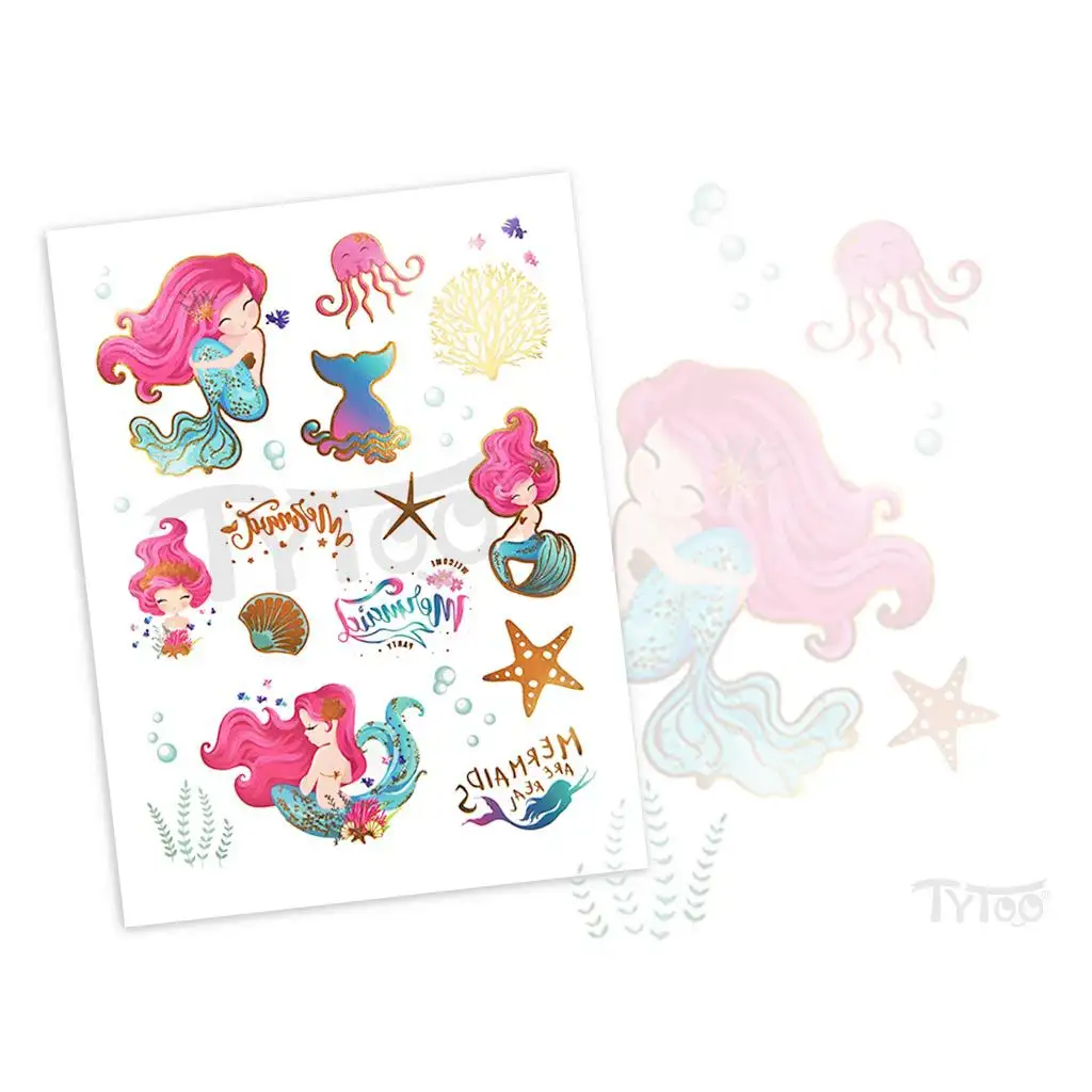 Dočasné tetování lze odstranit bez poškození nebo podráždění kůže, takže jsou perfektní volbou pro speciální příležitosti nebo letní plážování. Velikost archu je 160 x 120 mm a obsahuje čtyři nádherné vzory mořských panen, stejně jako speciální vodní živočichy a rostliny, aby byl zážitek ještě bohatší.