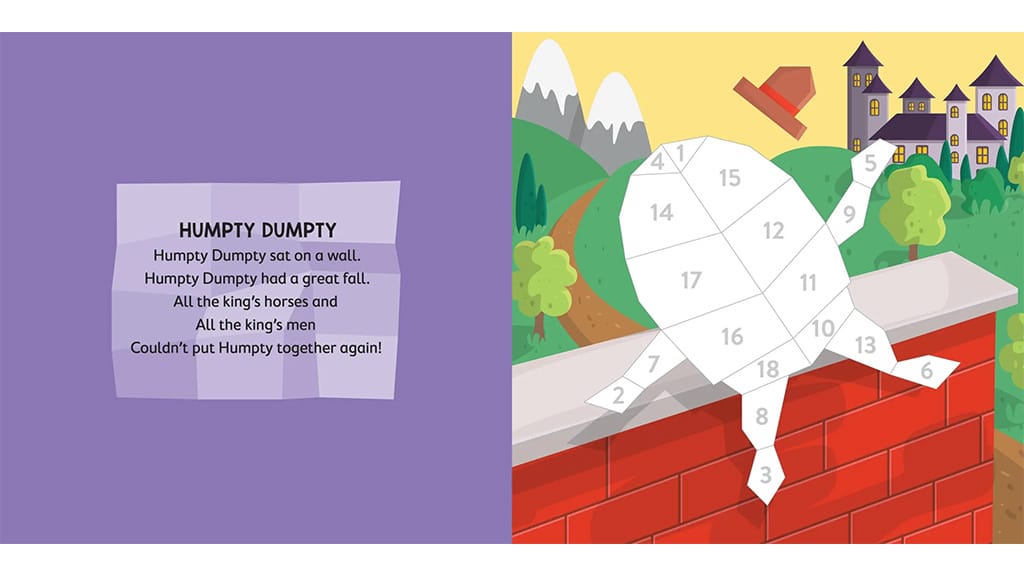 Večerní pohádky jsou nyní obohaceny o denní aktivity díky samolepkové knize Nursery Rhymes. Děti mohou znovu vytvořit scény z klasických příběhů, jako jsou „Humpty Dumpty“, „Jack and Jill“, „Hickory Dickory Dock“ a mnoho dalších známých říkanek. Kromě kreativních aktivit se samolepkami najdou děti na zadní straně každé stránky texty oblíbených dětských písní, takže čtení je ještě zábavnější. Tato kniha nejen rozvíjí zručnost, ale také pomáhá dětem poznat a oblíbit si nejznámější anglické říkanky, přičemž poskytuje společný zážitek pro všechny členy rodiny.