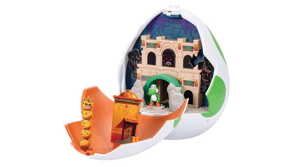 Jedním z nejvýraznějších kousků kolekce je herní sada Yoshi Egg. Děti mohou rozbít zelenou, vejcovitou krabičku, aby objevily dvě různé scény, z nichž každá připomíná cestu Yoshiho k tomu, jak se stává přítelem Maria. Newyorská strana představuje historické muzeum s rozpadající se dinosauří kostrou. Po průchodu dveřmi se dostaneme na stranu Dry Outpost, kde na děti čeká kouzelná trubka, pohybliví netopýři na stisknutí tlačítka a vyskakující Pokey. Sadu doplňuje 3,8 cm vysoká figurka Yoshiho a exkluzivní Fire Mario. Tato herní sada nabízí nejen vzrušující dobrodružství, ale také rozvíjí dětskou představivost a kreativitu, zatímco se mohou ponořit do světa Super Mario.