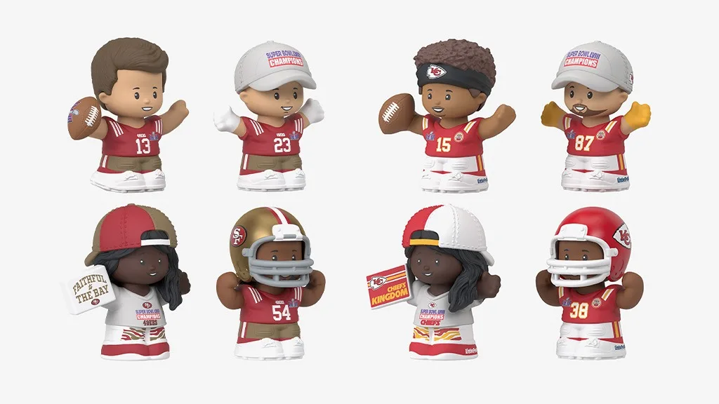 První Barbie NFL Super Bowl šampionky jsou plně oblečeny v fanouškovském vybavení týmů, včetně bublinkových bund, dresů a kšiltovek Super Bowl LVIII. Sady Fisher-Price Little People Collector Super Bowl obsahují tři figurky letošních NFL šampionů a také jednoho fanouška.
